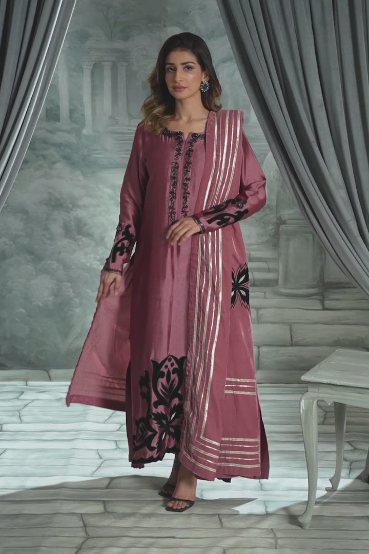 Indulge in the soft elegance of pure Shisha Silk in a delicate Tea Pink hue. This stunning set is paired with a breathtaking Velvet Chaddar that exudes opulence. The shawl is a masterpiece, adorned with intricate velvet applique work, sparkling Cut Dana, brilliant crystals, and exquisite stone work. Colour: Pink...
