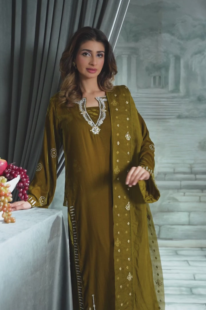 This striking Mustard Brown Long Shirt. The rich hue is instantly elevated by exquisite silver sequins work, glittering crystal work, and shimmering stones. Paired with a gorgeously textured crushed Dhaka, this ensemble is ready for any grand celebration. Colour: Mustard Brown Fabric Details:Shirt: Velvet Shirt Pant: Silk Crush PantDupatta: Organza