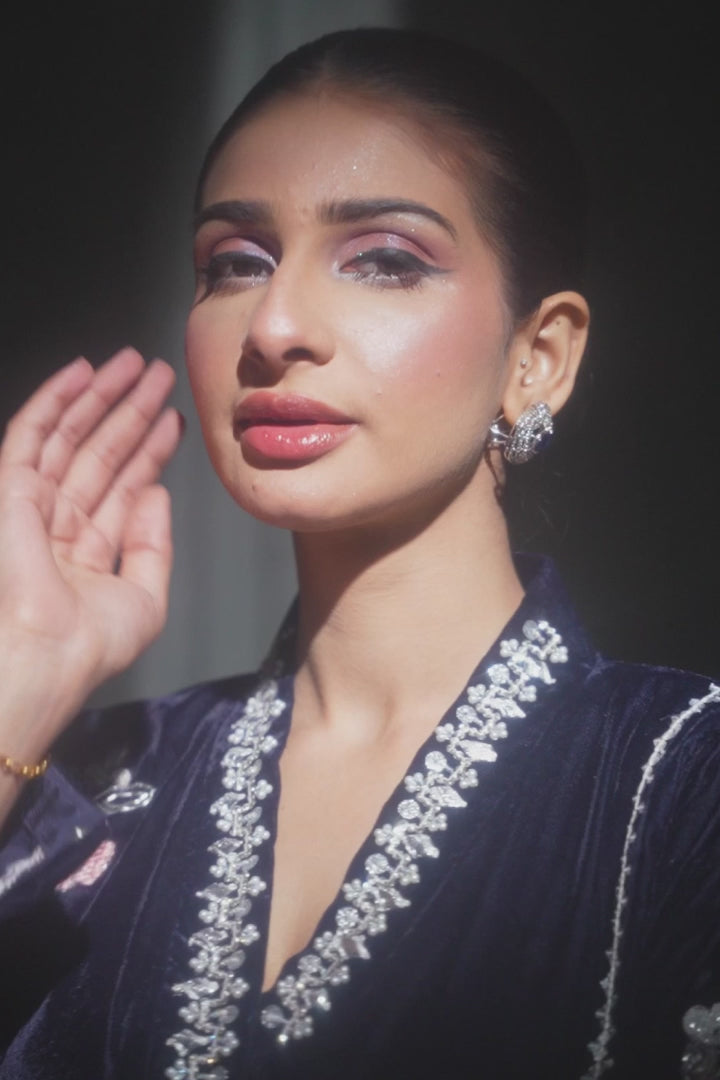 This stunning ensemble features rich Navy Blue Velvet with beautiful French knots, sparkling crystals, sequins, and classic Kora & Dabka handwork. Finished with a chic two-toned dupatta.